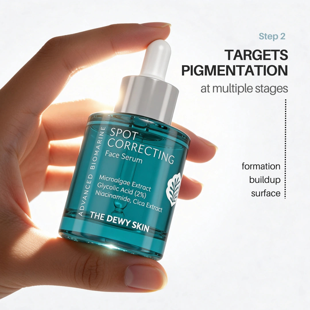 Spot Correcting Face Serum (30 ML)is powered by Amber Microalgae Extract (a smart melanin modulator), Niacinamide and Glycolic Acid to help fade dark spots, acne marks and sun-induced discoloration. It works across pigmentation formation and surface buildup to promote clearer, more even-looking skin.